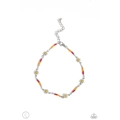 Infused along a classic silver chain, Pink Peacock, orange, and glassy yellow seed beads alternate with white daisy charms around the ankle for an optimistic display. Features an adjustable clasp closure.