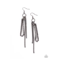 Infused with strands of classic gunmetal chain and gunmetal popcorn chain, a row of glassy white rhinestones delicately loops into a glitzy tassel. Earring attaches to a standard fishhook fitting.