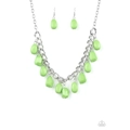 A collection of round and faceted green beads swings from the bottom of a bulky silver chain below the collar, creating a vivacious fringe. Features an adjustable clasp closure.