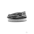 An elongated black suede band is encrusted in sections of braided white, smoky, and black rhinestones and rows of neatly stacked white rhinestones. The elongated band wraps three times around the wrist for a fierce one-of-a-kind look. Features an adjustable snap closure.