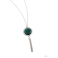 Encased in a frame of dazzling white rhinestones, a glowing green cat's eye stone pendant swings from the bottom of an elongated silver chain. A classic silver tassel swings from the bottom of the colorful pendant for a refined finish. Features an adjustable clasp closure.