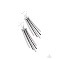 Strands of glistening dainty white pearls dance beside dainty black rhinestones in silver-pronged fittings from a silver horizontal bar, tapering and dripping below the ear for a dazzling look. Earring attaches to a standard fishhook fitting.
