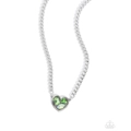 Pronged along the center of a silver heart frame, a trio of green and green iridescent marquise-cut, emerald-cut, and heart gems glistens below the neckline, attached to a glistening silver curb chain for a heartfelt haute look. Features an adjustable clasp closure. Due to its prismatic palette, color may vary.
