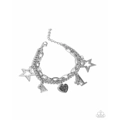 A collection of sporty-inspired silver charms, including stars, a white rhinestone-lined cheer megaphone, a white rhinestone-dusted "#1," and a heart inscribed with the inspirational phrase "You Go Girl!", dangle from layered silver curb and paperclip chains, creating playful spirit along the wrist. Features an adjustable clasp closure.