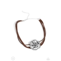 Etched in linear texture, an oversized, glistening, three-dimensional silver rose slides along strips of brown suede, creating a floral centerpiece around the collar. Features an adjustable clasp closure.