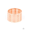 Filled with airy stenciled floral patterns, rectangular shiny copper frames are threaded along stretchy bands around the wrist, creating a whimsical centerpiece.