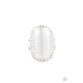 An oversized white cat's eye stone sits atop an icy silver frame bedazzled in blinding white rhinestones for a luxurious look. Features a stretchy band for a flexible fit.