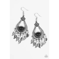 A black stone is pressed into the bottom of an ornate silver teardrop. Brushed in an antiqued shimmer, lifelike silver feathers dangle from the bottom of the textured frame for a seasonal look. Earring attaches to a standard fishhook fitting.