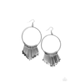 A glistening collection of flat silver ladle-like rods swings from the bottom of a silver wire hoop, resulting in an edgy fringe. Earring attaches to a standard fishhook fitting.