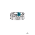 A white rhinestone encrusted, decorative silver, and shiny silver band stack across the finger. A glittery blue rhinestone crowns the uppermost band for a regal finish. Features a stretchy band for a flexible fit.