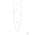 Infused with pink stone beads give way to layers of shimmery silver chain down the chest. A pink stone pendant and shiny silver frame drape above the cascade of silver chains for a seasonal flair. Features an adjustable clasp closure.
