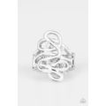 Painted in a shiny white finish, glistening silver ribbons whirl around dainty white rhinestones, coalescing into a whimsical frame atop the finger. Features a stretchy band for a flexible fit.