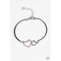 Encrusted in glittery pink rhinestones, a sparkling heart frame joins a dainty silver heart frame at the center of the wrist. The romantic centerpiece attaches to two glistening silver bars, creating a bangle-like bracelet. Features an adjustable clasp closure.