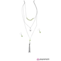 A row of bright green beads is strung through the uppermost chain above a swooping bird pendant and a shimmery silver tassel. Complemented with an additional green bead, the tassel swings freely from the bottom of the display for a whimsical finish. Features an adjustable clasp closure. Sold as one individual necklace. Includes on pair of matching earrings.