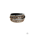 Smoky and white emerald cut rhinestones and flat gold cube beads are encrusted along strands of black suede for a sassy look. The elongated band double wraps around the wrist for a fierce one-of-a-kind look. Features an adjustable snap closure.