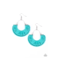 Shiny Blue Tint thread wraps and knots around a silver half moon frame, creating a colorful boho frame. Earring attaches to a standard fishhook fitting.