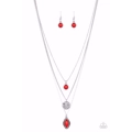 Three mismatched silver chains layer below the collar. A round red bead swings from the uppermost chain, above a scratched silver disc, and marquise-shaped red bead for a colorfully layered look. Features an adjustable clasp closure.