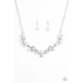Glistening ribbons of silver delicately twist and knot below the collar. Dramatic white rhinestones and classic white pearls are sprinkled across the swooping frames for a timeless finish. Features an adjustable clasp closure.