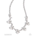 Nestled in silver-pronged fittings, clusters of glossy white pearls and dazzling white rhinestones join below the collar, creating refined frames. Infused with a glistening silver cable chain, the sections of ladylike luminescent frames timelessly trickle along the neckline. Features an adjustable clasp closure.