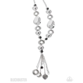 Connected to an elongated silver paperclip chain, a collection of round silver beads, textured silver rings, defaced smoky beads, and curved plates of silver connect and lead down to an additional textured silver ring. A tassel of various silver chains, a crystal-like bead, a defaced smoky bead, and textured charms, including a crescent moon, heart, and ring give way from a silver bead and solitaire defaced smoky bead, creating an eclectic, extravagant extended pendant.