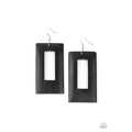 Brushed in a neutral black finish, a thick rectangular wooden frame swings from the ear for a retro look. Earring attaches to a standard fishhook fitting.