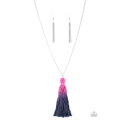 A knotted tassel gradually fades from purple to Blue Depths at the bottom of a lengthened silver chain, creating a colorful pendant. Features an adjustable clasp closure.
