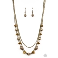 Infused with two layers of dainty brass chains, pearly brass beads and sparkling aurum rhinestones link below the collar for a demure look. Features an adjustable clasp closure.