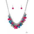 Varying in shape, glassy and polished blue, green, and pink beads swing from the bottom of interlocking silver chains. Crystal-like teardrops are sprinkled along the colorful beading, creating a flirtatious fringe below the collar. Features an adjustable clasp closure.