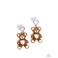 Playful adorable teddy bear charms, crafted with a glossy brown finish, displays a shimmering, heart-shaped gem at its center, perfectly matching the iridescent pink heart stud that secures the design. Earring attaches to a standard post fitting.