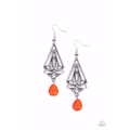A refreshing orange teardrop stone swings from the bottom of an ornate triangular frame, creating a seasonal statement. Earring attaches to a standard fishhook fitting.