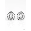 A teardrop silver frame is encrusted in glittery white rhinestones, creating a sparkling floral frame. Earring attaches to a standard post fitting.