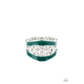 Glittery white rhinestones dance between two shiny Quetzal Green bands, coalescing into a refined centerpiece. Features a stretchy band for a flexible fit.