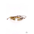 Faceted aurum, dainty aurum, and dainty brass cube beads are knotted along layers of brown cording. A shell-like centerpiece is added to the mix for a seasonal finish. Features an adjustable sliding knot closure.