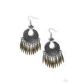 Tribal-inspired designs are embossed into an antiqued silver medallion-like frame. A fringe of dainty flared brass and silver rods attach to the bottom of the frame creating a tinkling charm. Earring attaches to a standard fishhook fitting.