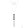 Sprinkled in glittery black prism style rhinestones, three sparkling silver frames trickle down the chest. A shimmery silver tassel swings from the bottom of the triple stacked pendant for a glamorous finish. Features an adjustable clasp closure.