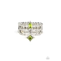 Three white rhinestone encrusted bands arc across the finger. A green square rhinestone, classic white rhinestone, and green teardrop rhinestone dot the bands, creating a sparkling centerpiece. Features a stretchy band for a flexible fit.