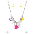 A strand of thick silver curb chain is decorated in playful charms, including a pink heart, a silver lightning bolt and star, a purple ring, and a flower silhouette topped with an orange bead at its center.