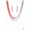 Rows of shimmery silver chain merge with shiny red chains, creating colorful layers below the collar. Features an adjustable clasp closure.
