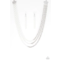 Rows of shimmery silver chain merge with shiny white chains, creating colorful layers below the collar. Features an adjustable clasp closure.