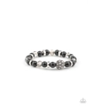 A refined collection of polished black beads, smoky crystal-like beads, shimmery silver accents, and a white rhinestone encrusted bead are threaded along a stretchy band around the wrist for a timeless look.