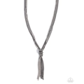 Strands of glistening, classic gunmetal chains join strands of white rhinestones in gunmetal square fittings in varying sizes, pulled together in a sassy knot at the center of the chest, creating a show-stopping fringe tassel. Features an adjustable clasp closure.