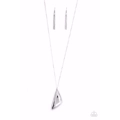 Cut into a striking triangular shape, a faceted white gem swings from the bottom of a lengthened silver chain for an edgy-glamorous fashion. Features an adjustable clasp closure.