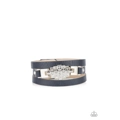 A white rhinestone silver centerpiece is studded in place by white rhinestone encrusted silver studs across the spliced center of a blue leather band, creating a glittery urban look around the wrist. Features an adjustable snap closure.