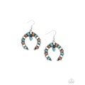Embellished in teardrop and marquise-cut turquoise, brown, and white stones that pattern in a free-spirited array, an upside-down silver-studded horseshoe curls below the ear. A solitaire turquoise teardrop stone dots the inner center of the horseshoe for additional earthy elegance. Earring attaches to a standard fishhook fitting. As the stone elements in this piece are natural, some color variation is normal.