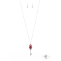 A luminescent red cat's eye stone is pressed into a silver key charm, creating a colorful pendant. Infused with iridescent red cat's eye beading, the silver key is encrusted in glittery white rhinestones for a dazzling finish. Features an adjustable clasp closure. Sold as one individual necklace. Includes one pair of matching earrings.