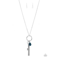 A blue teardrop gem, silver key, dainty crystal-like bead, and shimmery silver chain tassel swings from the bottom of a silver ring at the bottom of a lengthened silver chain, creating a whimsically tasseled display. Features an adjustable clasp closure.
