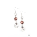 An oversized white teardrop gem swings from the bottom of a stacked pearly brown bead and classic white rhinestone, creating a timeless lure. Earring attaches to a standard fishhook fitting.