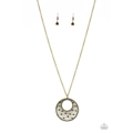 Dainty aurum rhinestones are sprinkled across a round brass frame radiating with linear patterns. The air pendant swings from the bottom of a lengthened brass chain for an edgy look. Features an adjustable clasp closure.