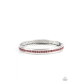 A fiery row of red rhinestones is encrusted along the center of a curving silver bar that hinges to a polished silver bar, creating a versatile bangle-like bracelet around the wrist.