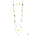 Infused with strands of mismatched silver chains, a strand of faceted silver and cloudy yellow beads trickle down the chest for a whimsically layered look. Features an adjustable clasp closure.